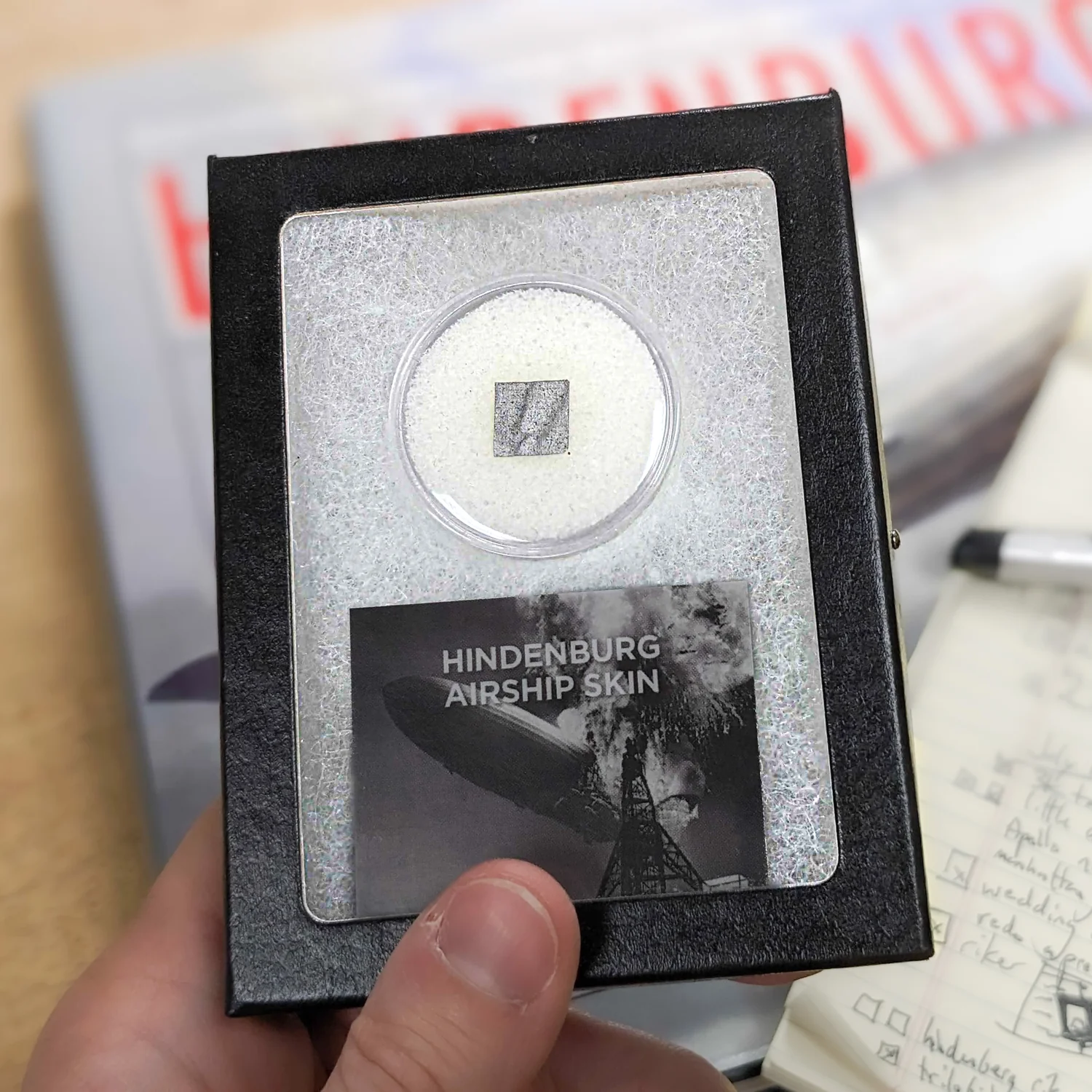 This specimen is a swatch of canvas fabric from the airship skin of the Hindenburg. The specimen was acquired from one of the largest private collections of Hindenburg artifacts in the world. It was originally retrieved at the scene in 1937 by journalist Harry Kroh, a local reporter dispatched to cover what was expected to be a routine landing but turned into one of the most well-covered disasters in history.